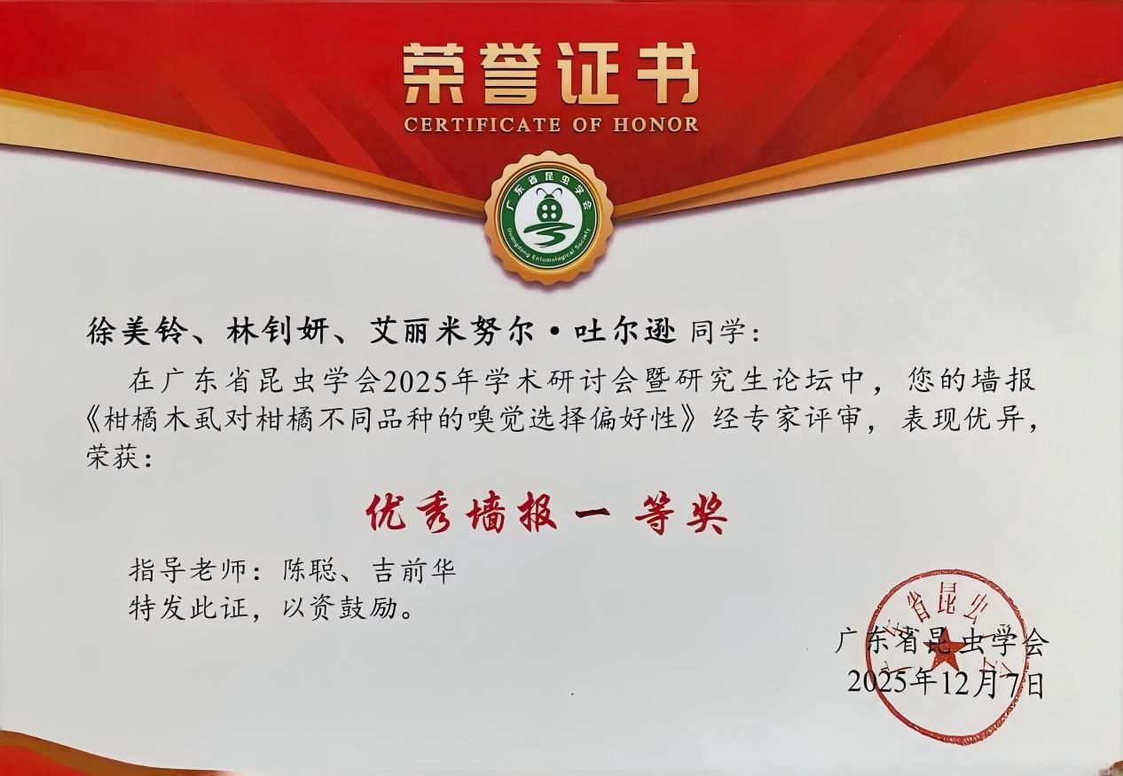 我校生命科学学院生物科学专业本科生徐美铃、林钊妍、艾丽米努尔·吐尔逊共同承担的2024年国家级大学生创新训练计划项目(编号:202410580009)完成的学术墙报作品《柑橘木虱对柑橘不同品种的嗅觉选择偏好性》在省昆虫学会2025年学术研讨会中荣获优秀墙报一等奖。
