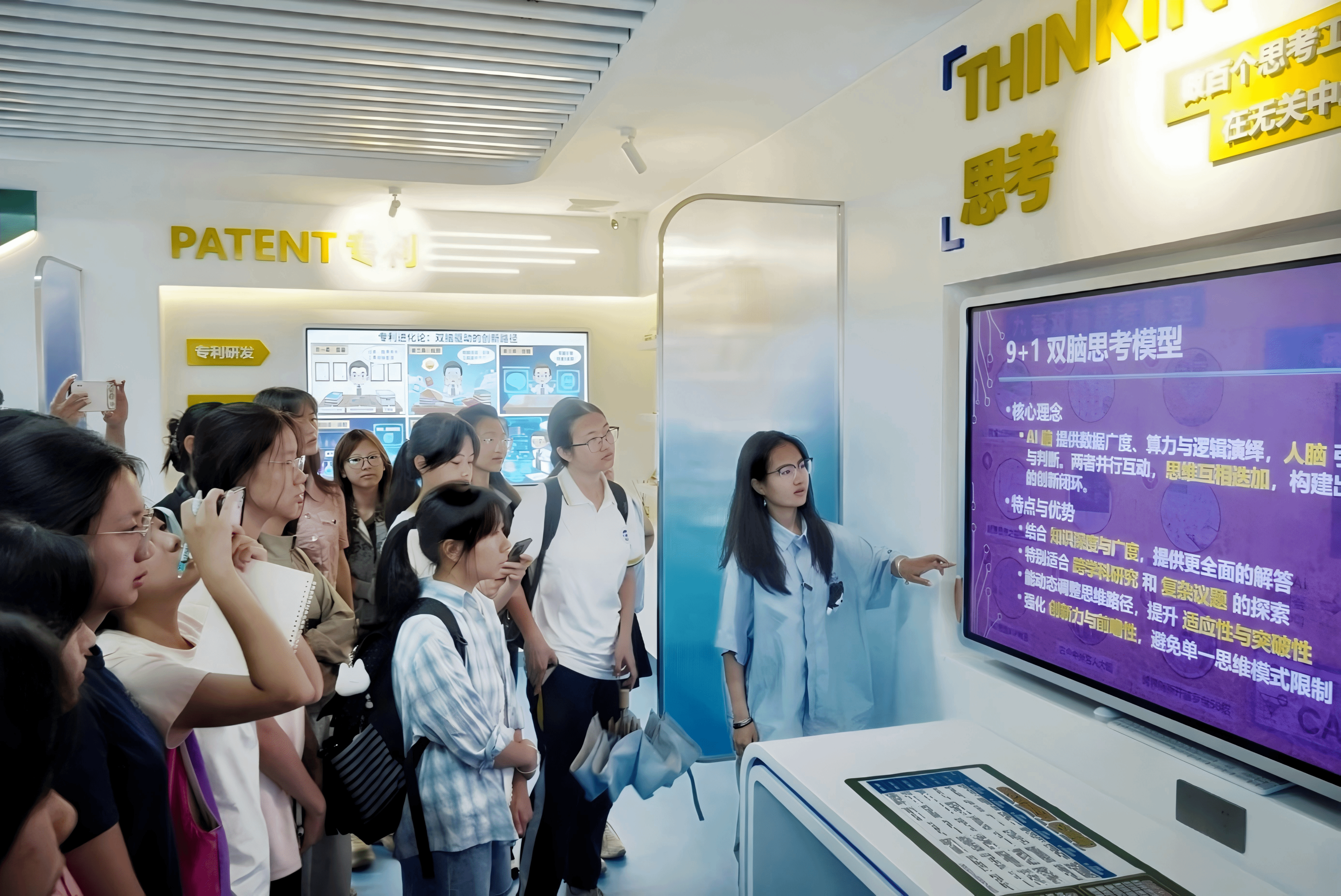 在陈永隆教授的引导下,师生依次参观主题区、知识区、思考区、思维区、未来教育区及元宇宙区,实地了解“双脑思考模型”“6D思维体系构建”等原创人工智能训练模型,直观感受学科交叉思维在思维拓展、逻辑训练、心理疏导及创新实践中的独特价值,近距离体会前沿科技与创新思维深度融合的强大动能。